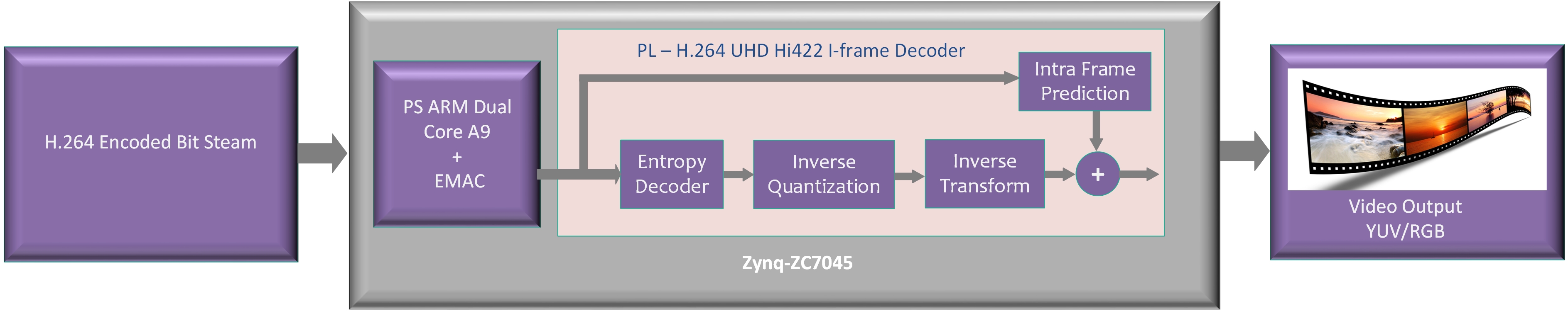 The decoder supports the H.264 Hi422 (High-422) profile at Level 5.1 (3840x2160p30) for Intra-only coding. Support for 10-bit video content means that there is no degradation of grayscale or color gradients in terms of banding. Support for YUV 4:2:2 video content means that there is better color separation, especially noticeable for red colors, which provides much sharper image details. These video quality aspects are especially important in case of medical imaging applications.