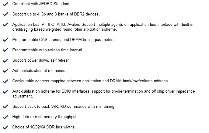 OVERVIEW The AL_DDR12_CTRL Memory Controller Core implements an efficient and pipelined interface to DDR-I and DDR-II SDRAM devices targeted for System-on-Chip (SoC) and FPGA platforms. The memory controller core is fully configurable to accommodate all the features in the JEDEC specification. The design has set of programmable registers to define the functionality of the memory controller and to configure the DRAM. On power-up the controller performs initialization of the DRAM based on the programmed paramerters in the registers. On completion of the initialization sequence, the DRAM will be ready to process READ/WRITE requests from the user. In case of multiple port access, an efficient Arbiter is used with programmable management scheme to have a fair arbitration. The controller also provides logic to support low-power applications by implementing SELF REFRESH and POWER-DOWN modes. The controller core has the following modules: « Control and Timing Engine « DRAM Initialization Engine « Command Generation Engine « Address Generation and Bank Management « Refresh Generation Engine « Multiport Weighted Round-robin Arbiter « Write Path and Read Capture Logic « Calibration Logic « PHY Logic for DDR I/O The AL_DDR12_CTRL Core is designed for performance with low latencies and maximum bandwidth allocation for up to 16 requestors. The AL_DDR12_CTRL Core is highly configurable allowing the user with several options such as: DRAM width, DRAM instance count, DRAM speed grade, DRAM CAS latencies, number of user ports for DRAM access. The Controller Core flexible user interfaces such as: Command/Data FIFO or AMBA-AHB or Altera Avalon Slave interfaces for easy SoC integration. |